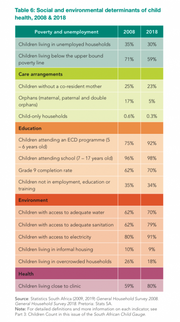 In Südafrika leben 19,7 Millionen Kinder (Einwohner unter 18 Jahre). 50% der Bevölkerung sind unter 25 Jahre alt. Obwohl die Kinderarmut in den letzten Jahren durch die Einführung und den Ausbau des Child Support Grant ( eine Art Kindergeld in Höhe von 430R pro Monat und Kind) gesunken ist, leben fast immer noch 60% der Kinder unterhalb der Armutsgrenze ( Haushalt mit weniger als 1.183 R pro Kopf Einkommen). 12 Millionen Kinder beziehen den CSG.